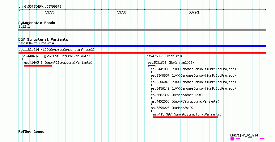 Variant DetailsVariant: dgv1183e214| Internal ID | 20122606 | | Landmark | | | Location Information | | | Cytoband | 6p12.1 | | Allele length | | Assembly | Allele length | | hg38 | 34384 | | hg19 | 34384 |