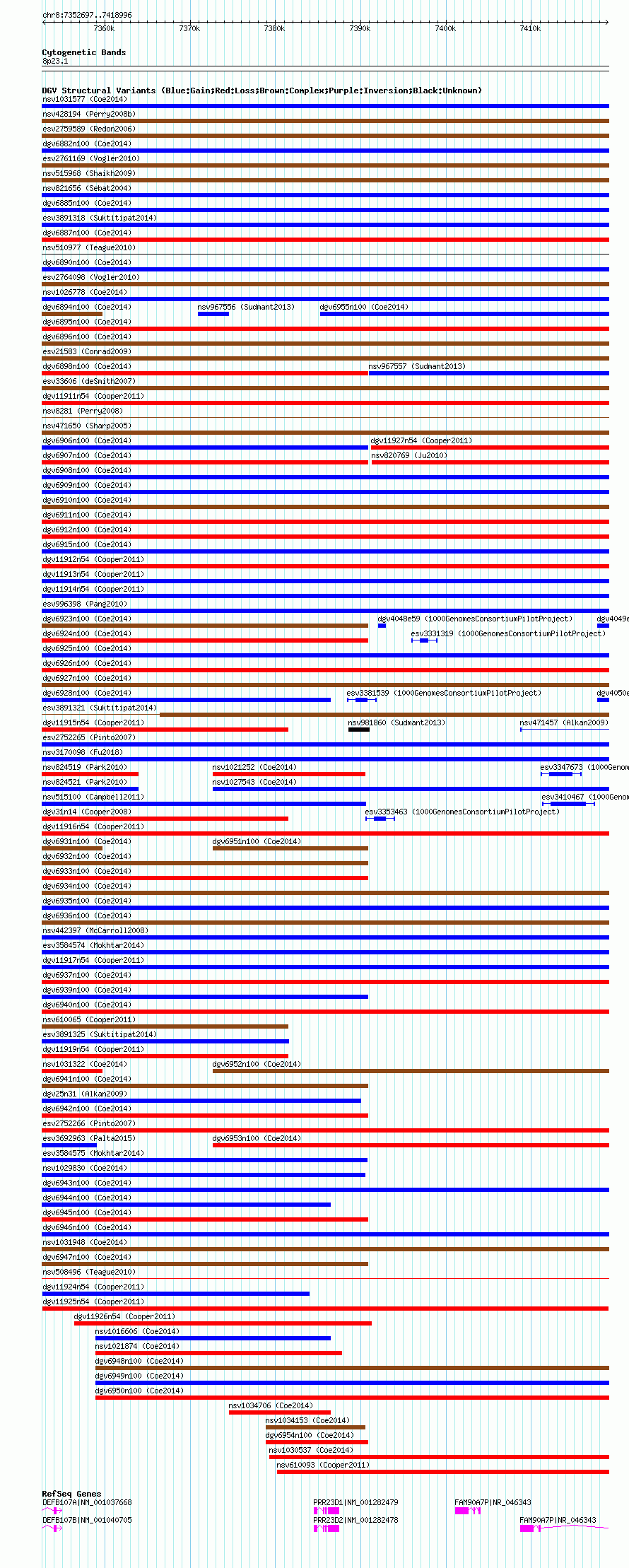 Variant DetailsVariant: dgv11925n54| Internal ID | 22779820 | | Landmark | | | Location Information | | | Cytoband | 8p23.1 | | Allele length | | Assembly | Allele length | | hg38 | 66300 | | hg19 | 66300 | | hg18 | 66300 |