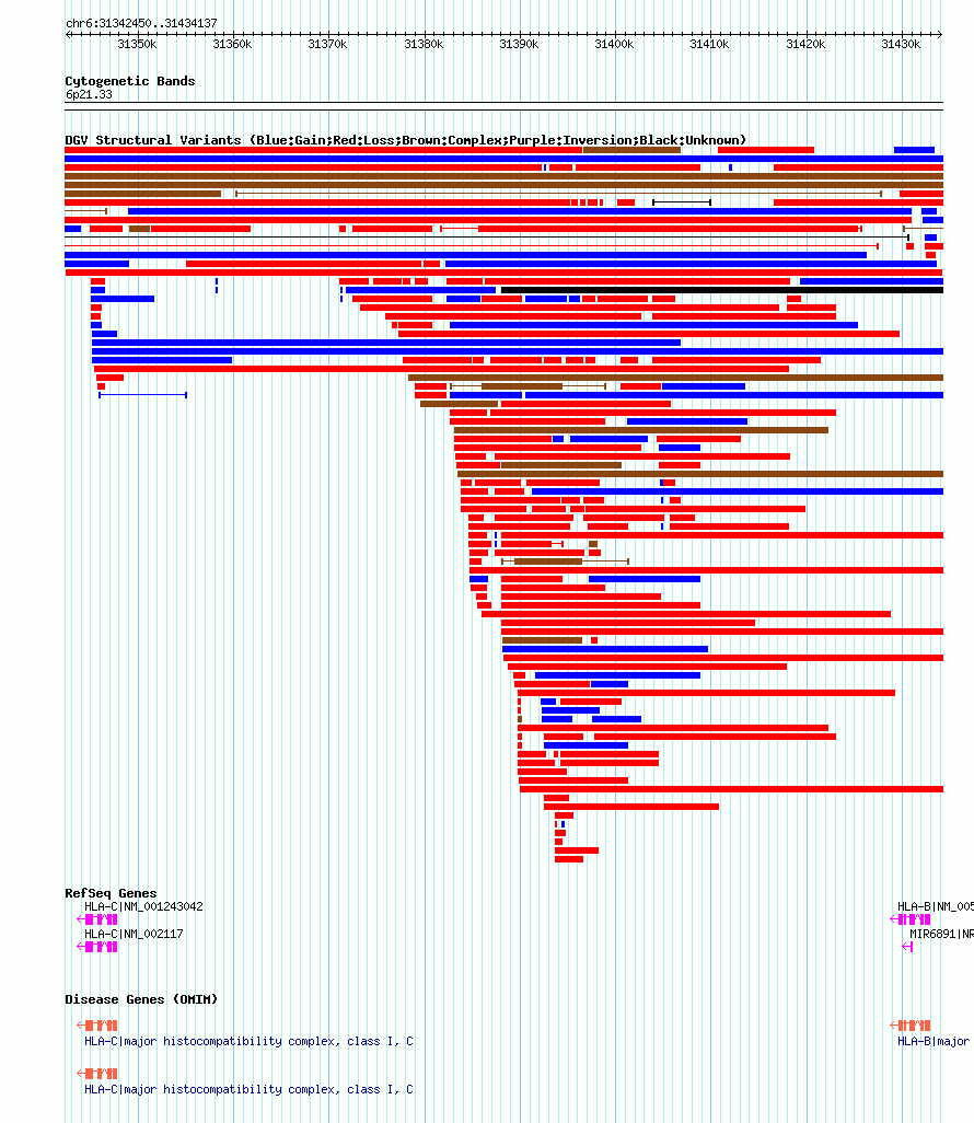 Variant DetailsVariant: dgv119e19 | Internal ID | 22759299 | | Landmark | | | Location Information | | | Cytoband | 6p21.33 | | Allele length | | Assembly | Allele length | | hg38 | 91688 | | hg19 | 91688 | | hg18 | 91688 |