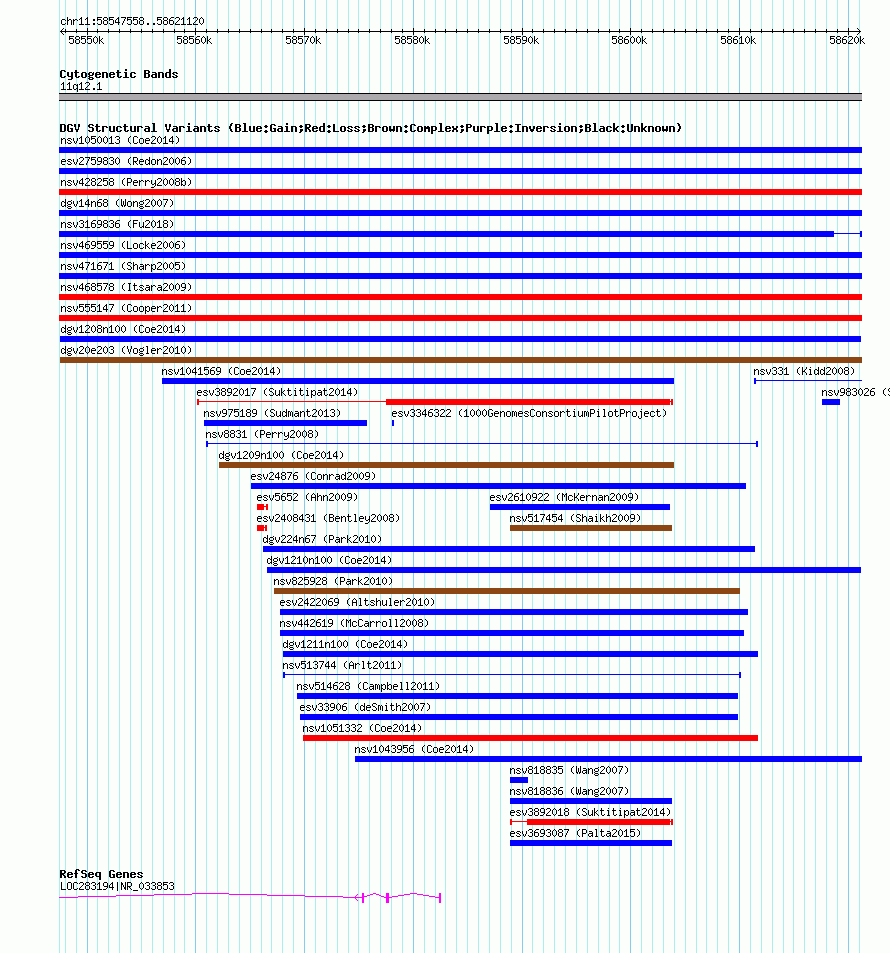 Variant DetailsVariant: dgv1208n100| Internal ID | 22787295 | | Landmark | | | Location Information | | | Cytoband | 11q12.1 | | Allele length | | Assembly | Allele length | | hg38 | 73563 | | hg19 | 73563 | | hg18 | 73563 |