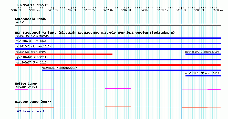 | | Variant Type | CNV loss | | Copy Number | | | Allele State | | | Allele Origin | | | Probe Count | | | Validation Flag | | | Merged Status | M | | Merged Variants | | | Supporting Variants | nsv824827, nsv824826 | | Samples | AK6, AK4 | | Known Genes | JAK2 | | Method | Oligo aCGH | | Analysis | To select parameters for calling CNVs (that is, the statistical threshold of the ADM2 algorithm, the minimum +/- log2 ratio and the minimum number of consecutive probes in a CNV interval), we calculated the sensitivity and positive predictive value based on the comparison of aCGH-based CNV calls (using our high-resolution Agilent 24M platform) with read-depth sequence data for two samples from Korean individuals (AK1 and AK2). We attempted to obtain `absolute' copy number status of the sample from NA10851, which was used as the reference sample for aCGH experiments in this study. For this, we used read-depth data for NA10851 obtained from massively parallel sequencing by the Illumina GA II data. The read-depth data represent the copy number status of NA10851 as compared to the human reference genome (hg18) because the short read sequences were aligned to hg18. | | Platform | Agilent 24M aCGH | | Comments | | | Reference | Park_et_al_2010 | | Pubmed ID | 20364138 | | Accession Number(s) | dgv1208n67
