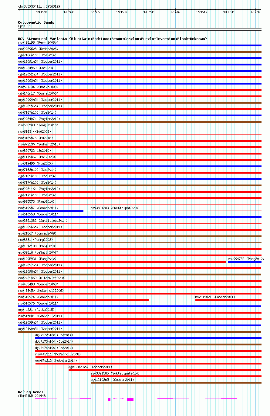 | | Variant Type | CNV gain+loss | | Copy Number | | | Allele State | | | Allele Origin | | | Probe Count | | | Validation Flag | | | Merged Status | M | | Merged Variants | | | Supporting Variants | nsv610997, nsv610985 | | Samples | | | Known Genes | ADAM5 | | Method | SNP array | | Analysis | Illumina SNP array copy number analysis | | Platform | Not reported | | Comments | | | Reference | Cooper_et_al_2011 | | Pubmed ID | 21841781 | | Accession Number(s) | dgv12100n54