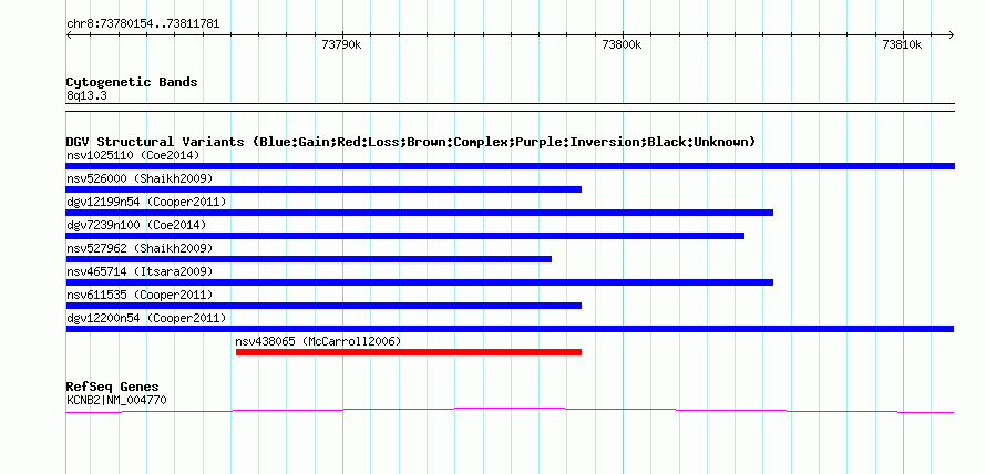 | | Variant Type | CNV gain | | Copy Number | | | Allele State | | | Allele Origin | | | Probe Count | | | Validation Flag | | | Merged Status | M | | Merged Variants | | | Supporting Variants | nsv611536, nsv611537 | | Samples | HGDP00886 | | Known Genes | KCNB2 | | Method | SNP array | | Analysis | Illumina SNP array copy number analysis | | Platform | Not reported | | Comments | | | Reference | Cooper_et_al_2011 | | Pubmed ID | 21841781 | | Accession Number(s) | dgv12200n54