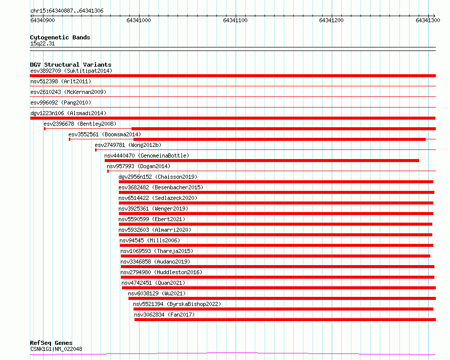 Variant DetailsVariant: dgv1223n106| Internal ID | 22795051 | | Landmark | | | Location Information | | | Cytoband | 15q22.31 | | Allele length | | Assembly | Allele length | | hg38 | 420 | | hg19 | 420 |