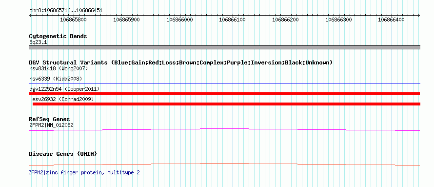 | | Variant Type | CNV loss | | Copy Number | | | Allele State | | | Allele Origin | | | Probe Count | | | Validation Flag | | | Merged Status | M | | Merged Variants | | | Supporting Variants | nsv611838, nsv611839 | | Samples | | | Known Genes | ZFPM2 | | Method | SNP array | | Analysis | Illumina SNP array copy number analysis | | Platform | Not reported | | Comments | | | Reference | Cooper_et_al_2011 | | Pubmed ID | 21841781 | | Accession Number(s) | dgv12252n54