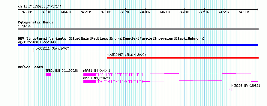 | Variant Type | CNV gain | Copy Number | | Allele State | | Allele Origin | | Probe Count | | Validation Flag | | Merged Status | M | Merged Variants | | Supporting Variants | nsv1036292, nsv1049887 | Samples | | Known Genes | ARRB1, MIR326, TPBGL | Method | SNP array | Analysis | Affymetrix SNP array copy number analysis | Platform | Affymetrix SNP Array 6.0 | Comments | | Reference | Coe_et_al_2014 | Pubmed ID | 25217958 | Accession Number(s) | dgv1225n100