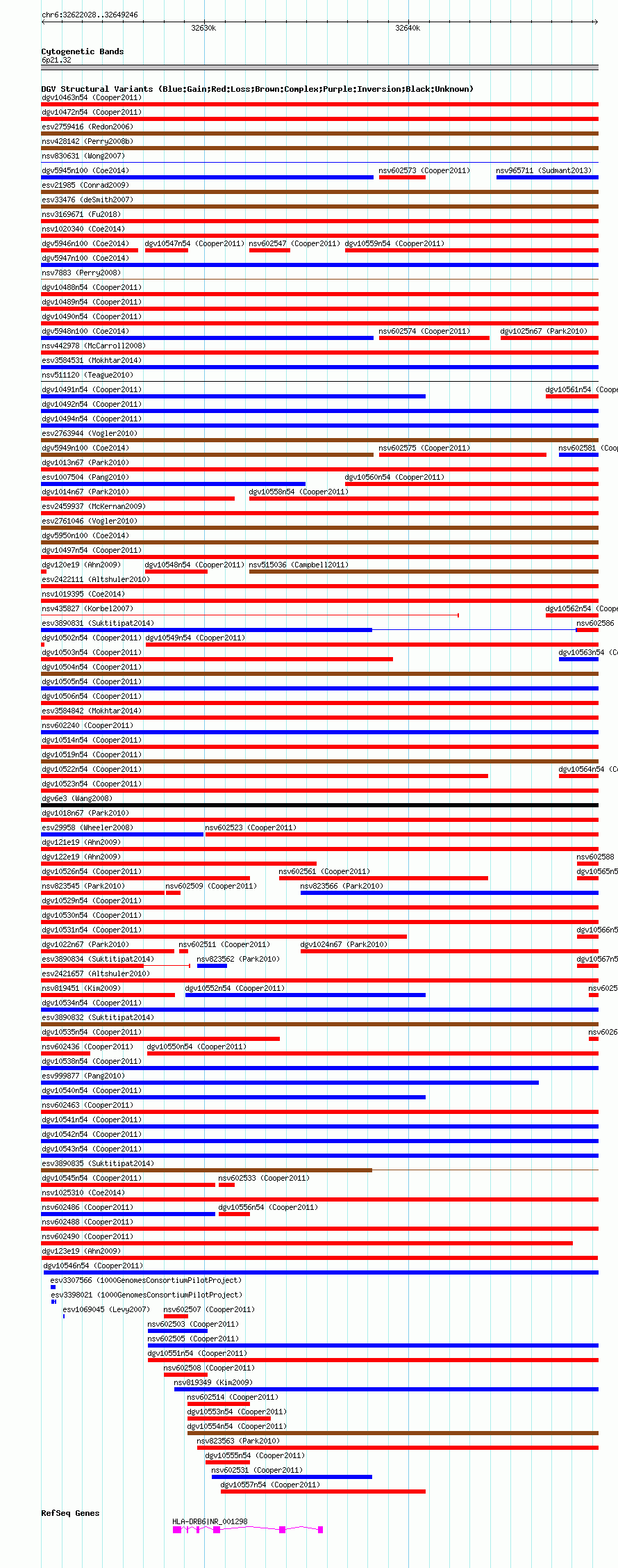 Variant DetailsVariant: dgv123e19 | Internal ID | 22759303 | | Landmark | | | Location Information | | | Cytoband | 6p21.32 | | Allele length | | Assembly | Allele length | | hg38 | 27219 | | hg19 | 27219 | | hg18 | 27219 |