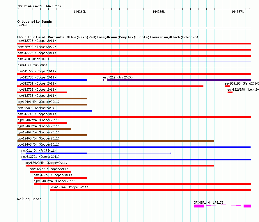 | | Variant Type | CNV gain | | Copy Number | | | Allele State | | | Allele Origin | | | Probe Count | | | Validation Flag | | | Merged Status | M | | Merged Variants | | | Supporting Variants | nsv612741, nsv612750 | | Samples | | | Known Genes | GPIHBP1 | | Method | SNP array | | Analysis | Illumina SNP array copy number analysis | | Platform | Not reported | | Comments | | | Reference | Cooper_et_al_2011 | | Pubmed ID | 21841781 | | Accession Number(s) | dgv12406n54