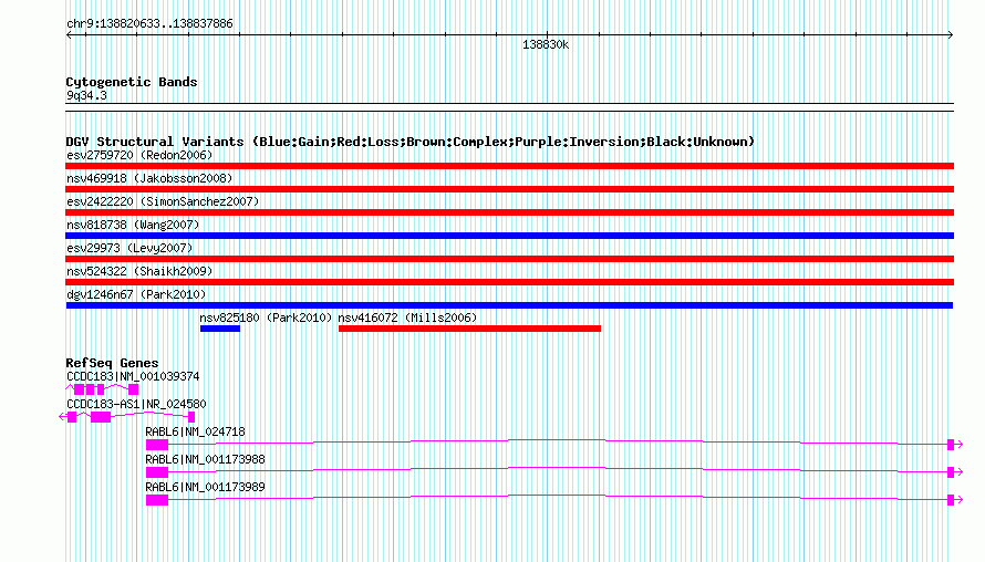Variant DetailsVariant: dgv1246n67 | Internal ID | 22782229 | | Landmark | | | Location Information | | | Cytoband | 9q34.3 | | Allele length | | Assembly | Allele length | | hg38 | 17254 | | hg19 | 17254 | | hg18 | 17254 |