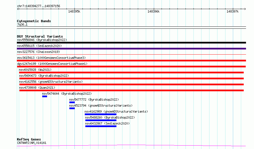 Variant DetailsVariant: dgv1247e199| Internal ID | 22759020 | | Landmark | | | Location Information | | | Cytoband | 7q36.1 | | Allele length | | Assembly | Allele length | | hg38 | 2880 | | hg19 | 2880 |