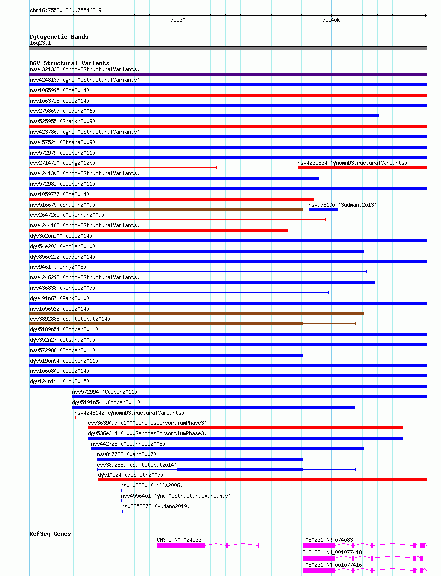 Variant DetailsVariant: dgv124n111| Internal ID | 20163853 | | Landmark | | | Location Information | | | Cytoband | 16q23.1 | | Allele length | | Assembly | Allele length | | hg38 | 26084 | | hg19 | 26084 |