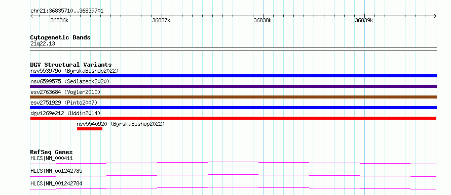 Variant DetailsVariant: dgv1269e212 | Internal ID | 22784196 | | Landmark | | | Location Information | | | Cytoband | 21q22.13 | | Allele length | | Assembly | Allele length | | hg38 | 3992 | | hg19 | 3992 |