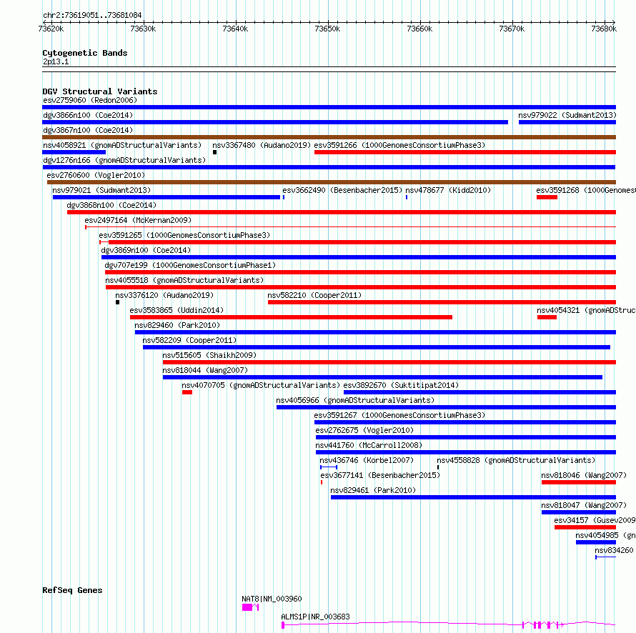 Variant DetailsVariant: dgv1276n166 Internal ID | 20166704 | Landmark | | Location Information | | Cytoband | 2p13.1 | Allele length | Assembly | Allele length | hg38 | 62034 | hg19 | 62034 |