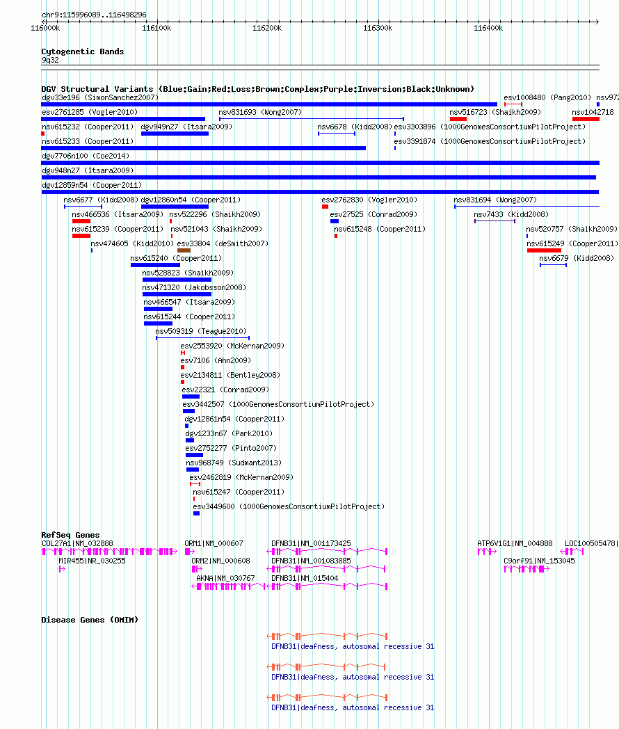 Variant DetailsVariant: dgv12859n54| Internal ID | 22780754 | | Landmark | | | Location Information | | | Cytoband | 9q32 | | Allele length | | Assembly | Allele length | | hg38 | 502208 | | hg19 | 502208 | | hg18 | 502208 |