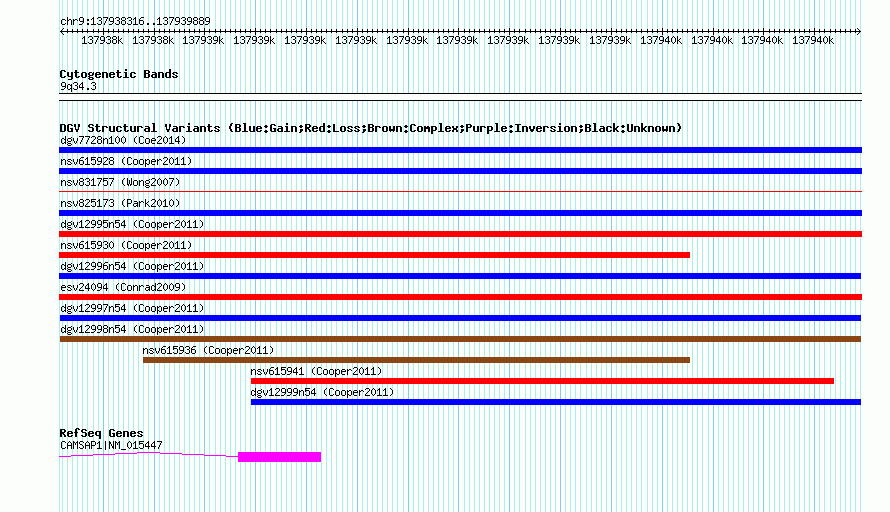 | | Variant Type | CNV gain+loss | | Copy Number | | | Allele State | | | Allele Origin | | | Probe Count | | | Validation Flag | | | Merged Status | M | | Merged Variants | | | Supporting Variants | nsv615935, nsv615937 | | Samples | | | Known Genes | CAMSAP1 | | Method | SNP array | | Analysis | Illumina SNP array copy number analysis | | Platform | Not reported | | Comments | | | Reference | Cooper_et_al_2011 | | Pubmed ID | 21841781 | | Accession Number(s) | dgv12998n54