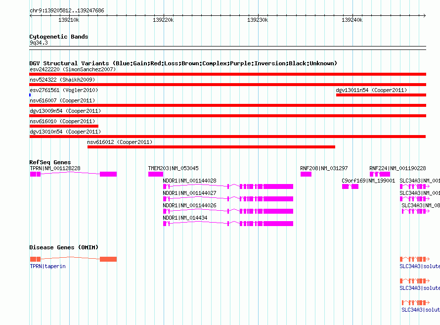 | | Variant Type | CNV loss | | Copy Number | | | Allele State | | | Allele Origin | | | Probe Count | | | Validation Flag | | | Merged Status | M | | Merged Variants | | | Supporting Variants | nsv616011, nsv616014, nsv616013 | | Samples | | | Known Genes | C9orf169, NDOR1, RNF208, RNF224, SLC34A3, TMEM203, TPRN | | Method | SNP array | | Analysis | Illumina SNP array copy number analysis | | Platform | Not reported | | Comments | | | Reference | Cooper_et_al_2011 | | Pubmed ID | 21841781 | | Accession Number(s) | dgv13010n54