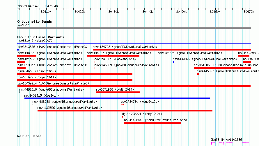 Variant DetailsVariant: dgv1305e214| Internal ID | 20122728 | | Landmark | | | Location Information | | | Cytoband | 7q21.11 | | Allele length | | Assembly | Allele length | | hg38 | 68868 | | hg19 | 68868 |