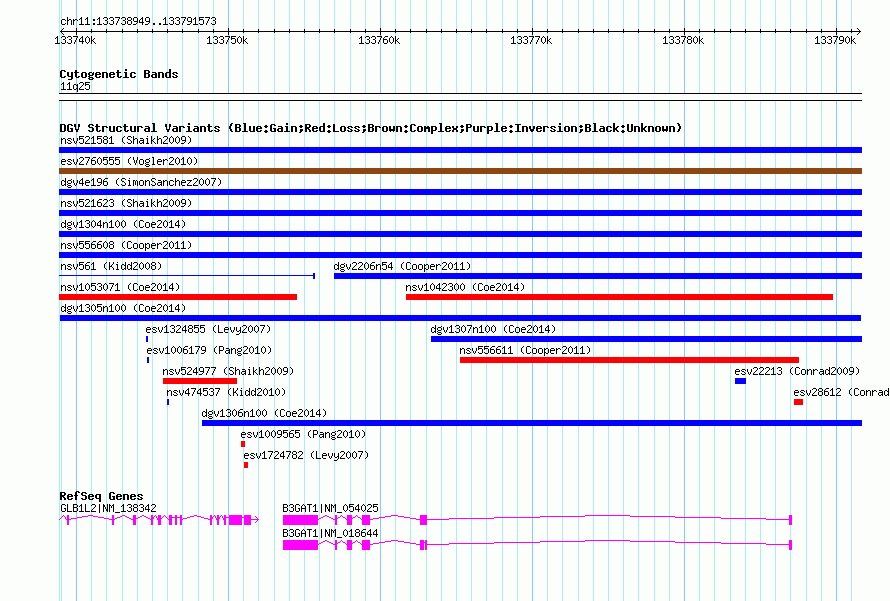 | | Variant Type | CNV gain | | Copy Number | | | Allele State | | | Allele Origin | | | Probe Count | | | Validation Flag | | | Merged Status | M | | Merged Variants | | | Supporting Variants | nsv1050936, nsv1049519, nsv1051445 | | Samples | | | Known Genes | B3GAT1, GLB1L2 | | Method | SNP array | | Analysis | Affymetrix SNP array copy number analysis | | Platform | Affymetrix SNP Array 6.0 | | Comments | | | Reference | Coe_et_al_2014 | | Pubmed ID | 25217958 | | Accession Number(s) | dgv1305n100