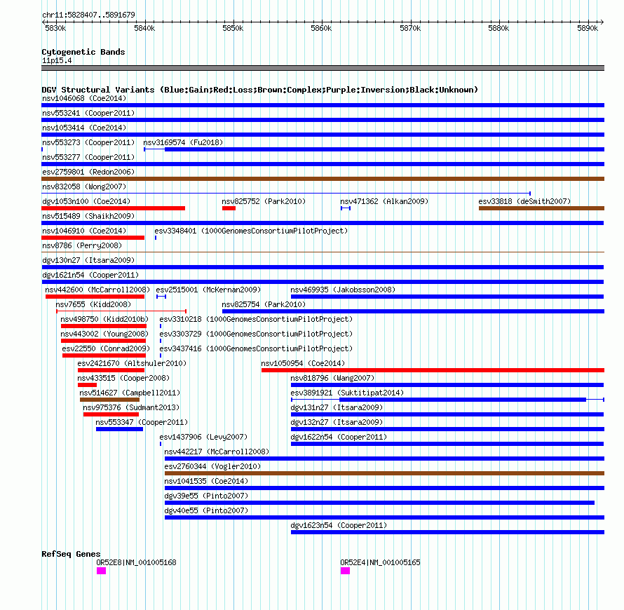 Variant DetailsVariant: dgv130n27| Internal ID | 22766859 | | Landmark | | | Location Information | | | Cytoband | 11p15.4 | | Allele length | | Assembly | Allele length | | hg38 | 63273 | | hg19 | 63273 | | hg18 | 63273 | | hg17 | 63273 |