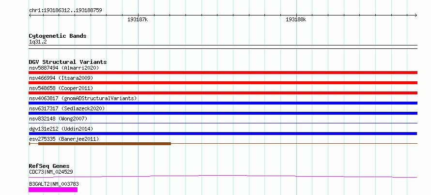 Variant DetailsVariant: dgv131e212| Internal ID | 22783058 | | Landmark | | | Location Information | | | Cytoband | 1q31.2 | | Allele length | | Assembly | Allele length | | hg38 | 2448 | | hg19 | 2448 |