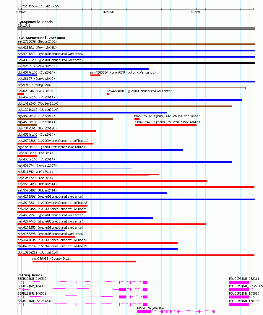 | Variant Type | CNV loss | Copy Number | | Allele State | | Allele Origin | | Probe Count | | Validation Flag | | Merged Status | M | Merged Variants | | Supporting Variants | esv3568424, esv3568422 | Samples | 401706BJ, 400818BL, 400205SP | Known Genes | POLDIP3, RRP7B, SERHL2 | Method | SNP array | Analysis | We used four separate algorithms to detect CNVs; Affymetrix Chromosome Analysis Suite (ChAS), iPattern, Nexus and Partek. Our primary analysis was performed based on ChAS CNV calls, which were then supported using the remaining three algorithms to construct a confidence set of CNVs. For all algorithms, we have used 8 probes and >1kb as a base line cutoff for CNV detection. | Platform | Affymetrix CytoScan HD 2.7M array | Comments | | Reference | Uddin_et_al_2014 | Pubmed ID | 25503493 | Accession Number(s) | dgv1323e212