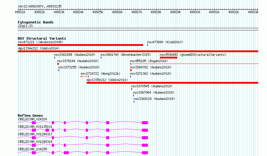 Variant DetailsVariant: dgv1334e212 | Internal ID | 20149790 | | Landmark | | | Location Information | | | Cytoband | 22q13.33 | | Allele length | | Assembly | Allele length | | hg38 | 12366 | | hg19 | 12366 |