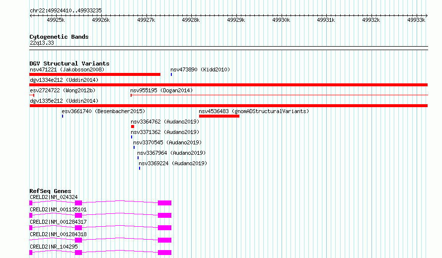 Variant DetailsVariant: dgv1335e212| Internal ID | 20149791 | | Landmark | | | Location Information | | | Cytoband | 22q13.33 | | Allele length | | Assembly | Allele length | | hg38 | 8826 | | hg19 | 8826 |
