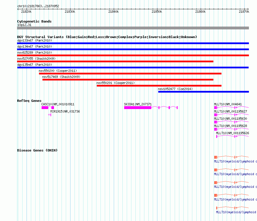 Variant DetailsVariant: dgv135n67 | Internal ID | 22781118 | | Landmark | | | Location Information | | | Cytoband | 10p12.31 | | Allele length | | Assembly | Allele length | | hg38 | 53090 | | hg19 | 53090 | | hg18 | 53090 |