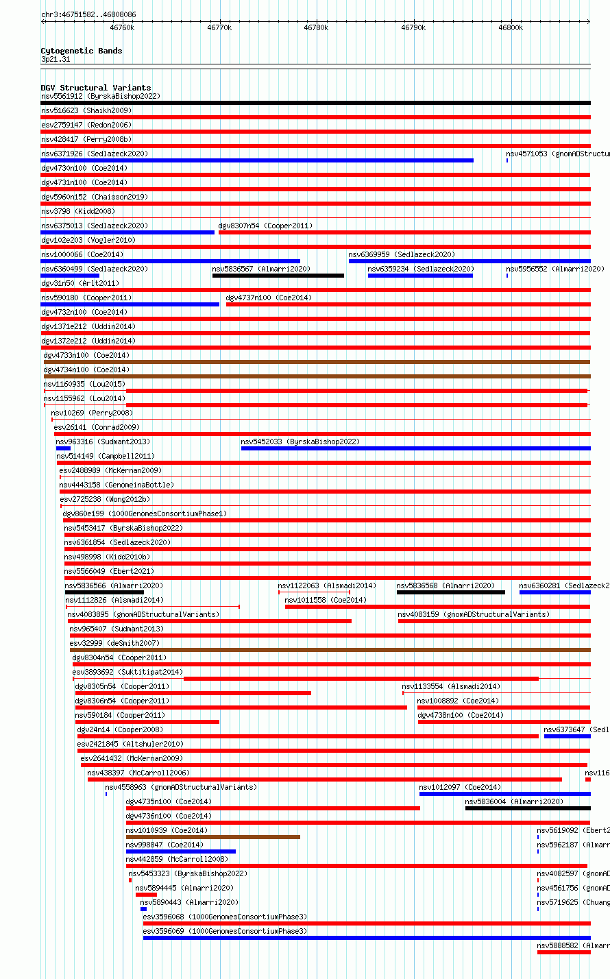 Variant DetailsVariant: dgv1371e212 | Internal ID | 22784298 | | Landmark | | | Location Information | | | Cytoband | 3p21.31 | | Allele length | | Assembly | Allele length | | hg38 | 56505 | | hg19 | 56505 |