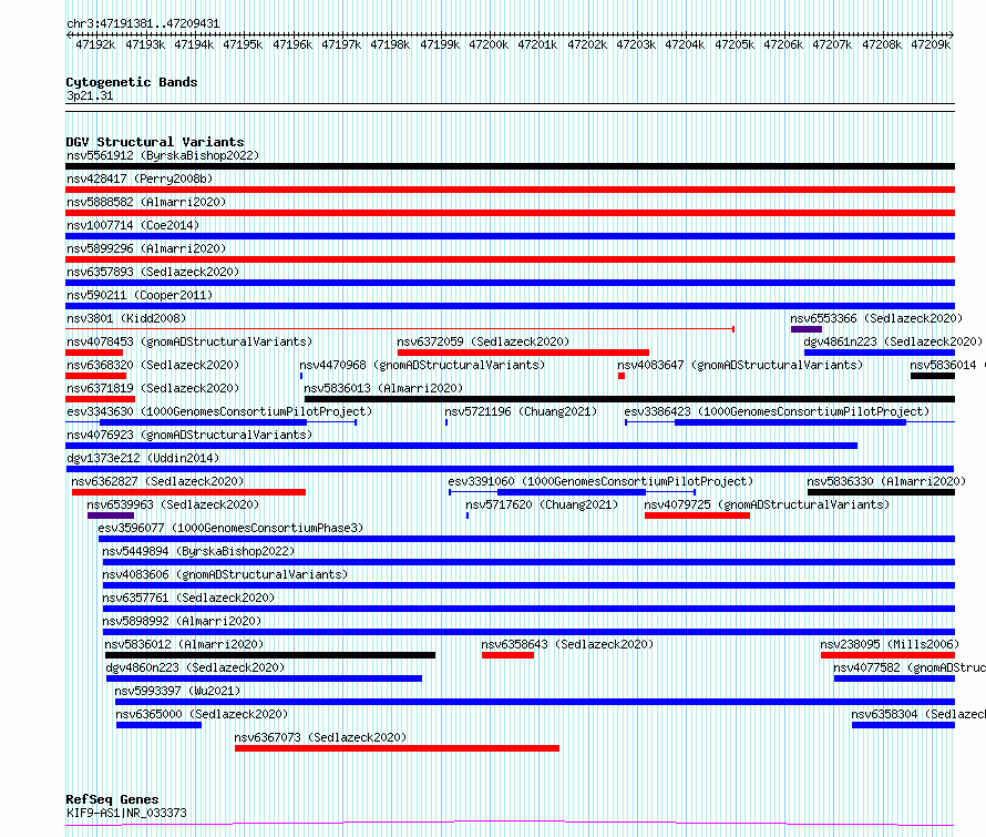 Variant DetailsVariant: dgv1373e212| Internal ID | 22784300 | | Landmark | | | Location Information | | | Cytoband | 3p21.31 | | Allele length | | Assembly | Allele length | | hg38 | 18051 | | hg19 | 18051 |