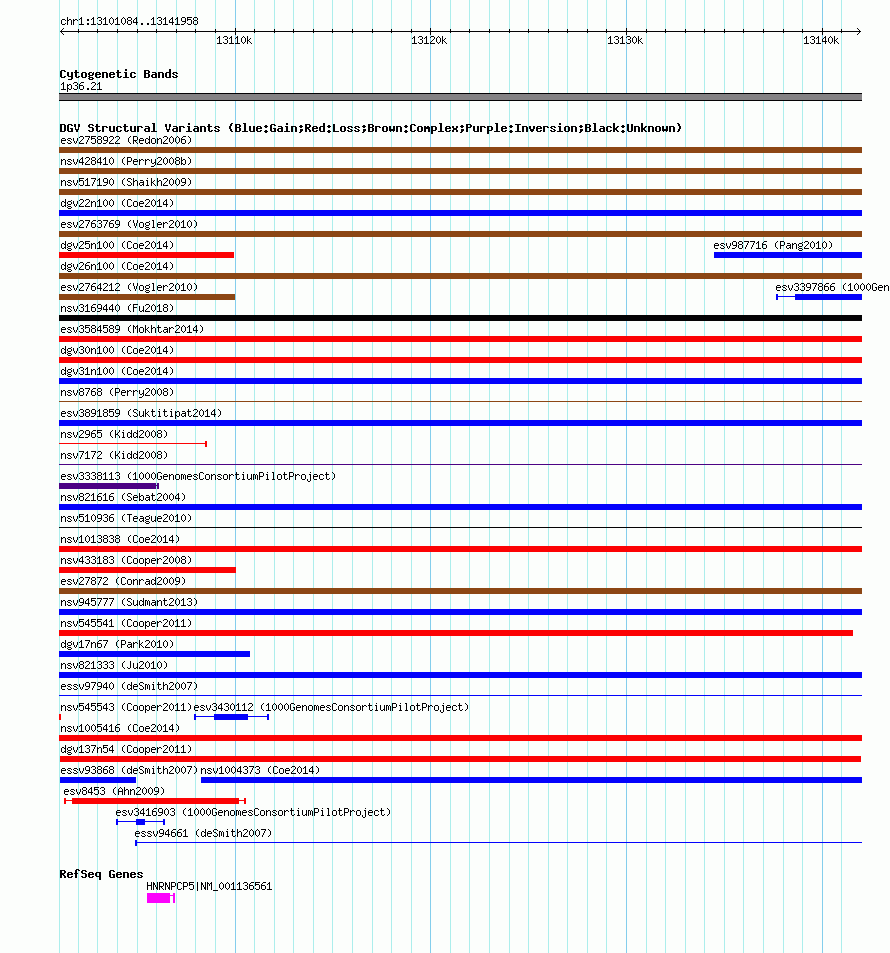 Variant DetailsVariant: dgv137n54| Internal ID | 22768032 | | Landmark | | | Location Information | | | Cytoband | 1p36.21 | | Allele length | | Assembly | Allele length | | hg38 | 40896 | | hg19 | 40875 | | hg18 | 40875 |
