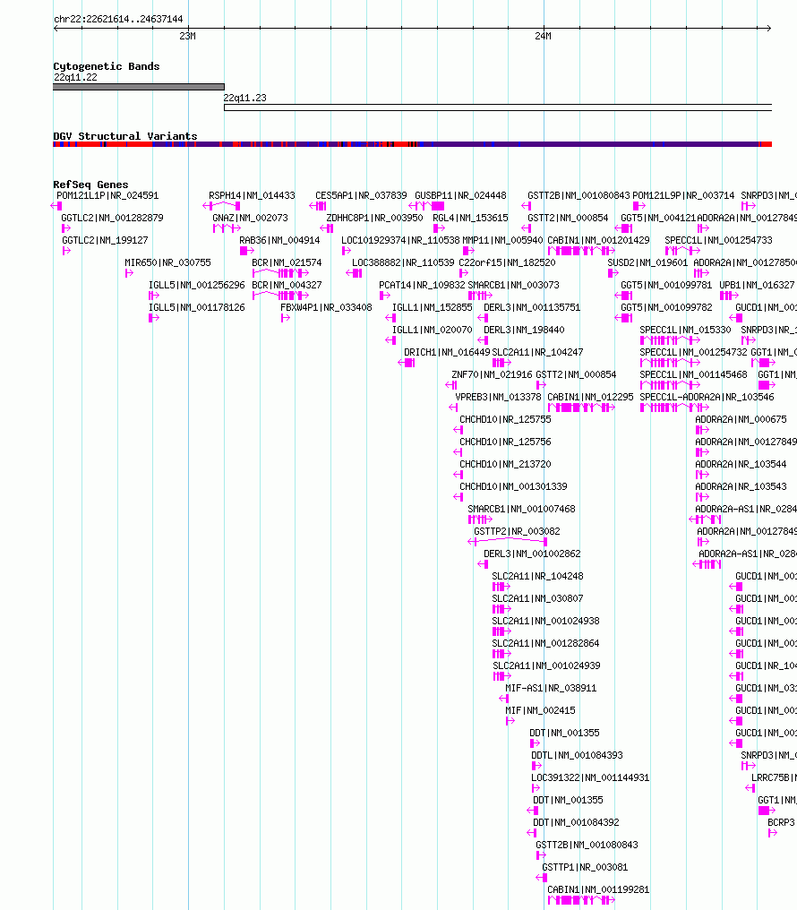 | | Variant Type | CNV deletion | | Copy Number | | | Allele State | | | Allele Origin | | | Probe Count | | | Validation Flag | | | Merged Status | M | | Merged Variants | | | Supporting Variants | nsv5958899, nsv5956621 | | Samples | | | Known Genes | ADORA2A, ADORA2A-AS1, BCR, BCRP3, C22orf15, C22orf43, CABIN1, CES5AP1, CHCHD10, DDT, DDTL, DERL3, FAM211B, FBXW4P1, GGT1, GGT5, GGTLC2, GNAZ, GSTT1, GSTT2, GSTT2B, GSTTP1, GSTTP2, GUCD1, GUSBP11, IGLL1, IGLL5, LOC284889, LOC391322, MIF, MIR650, MMP11, POM121L1P, POM121L9P, RAB36, RGL4, RTDR1, SLC2A11, SMARCB1, SNRPD3, SPECC1L, SPECC1L-ADORA2A, SUSD2, UPB1, VPREB3, ZDHHC8P1, ZNF70 | | Method | Sequencing | | Analysis | | | Platform | | | Comments | | | Reference | Almarri_et_al_2020 | | Pubmed ID | 32531199 | | Accession Number(s) | dgv1387n209