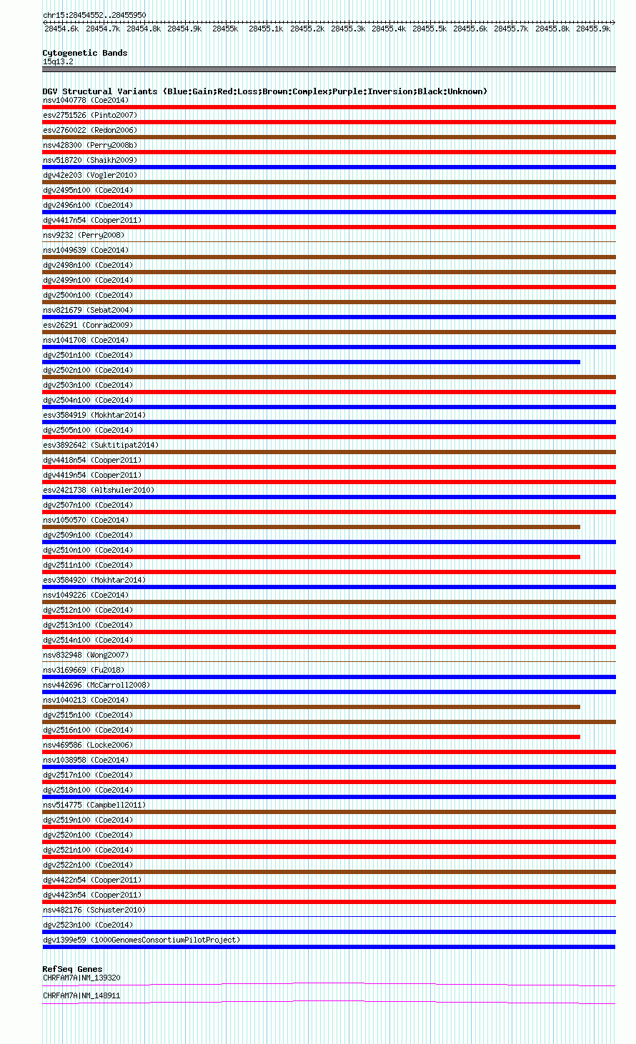 | | Variant Type | CNV duplication | | Copy Number | | | Allele State | | | Allele Origin | | | Probe Count | | | Validation Flag | | | Merged Status | M | | Merged Variants | | | Supporting Variants | esv3401885, esv3435221 | | Samples | NA19239, NA19240 | | Known Genes | CHRFAM7A | | Method | Sequencing | | Analysis | | | Platform | Illumina | | Comments | | | Reference | 1000_Genomes_Consortium_Pilot_Project | | Pubmed ID | 20981092 | | Accession Number(s) | dgv1399e59