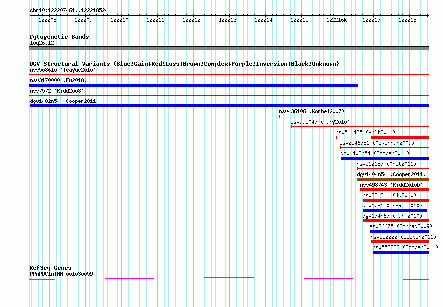 Variant DetailsVariant: dgv1402n54| Internal ID | 22769297 | | Landmark | | | Location Information | | | Cytoband | 10q26.12 | | Allele length | | Assembly | Allele length | | hg38 | 11064 | | hg19 | 11064 | | hg18 | 11064 |