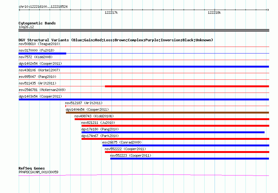 | | Variant Type | CNV gain | | Copy Number | | | Allele State | | | Allele Origin | | | Probe Count | | | Validation Flag | | | Merged Status | M | | Merged Variants | | | Supporting Variants | nsv552219, nsv552218 | | Samples | | | Known Genes | PPAPDC1A | | Method | SNP array | | Analysis | Illumina SNP array copy number analysis | | Platform | Not reported | | Comments | | | Reference | Cooper_et_al_2011 | | Pubmed ID | 21841781 | | Accession Number(s) | dgv1403n54