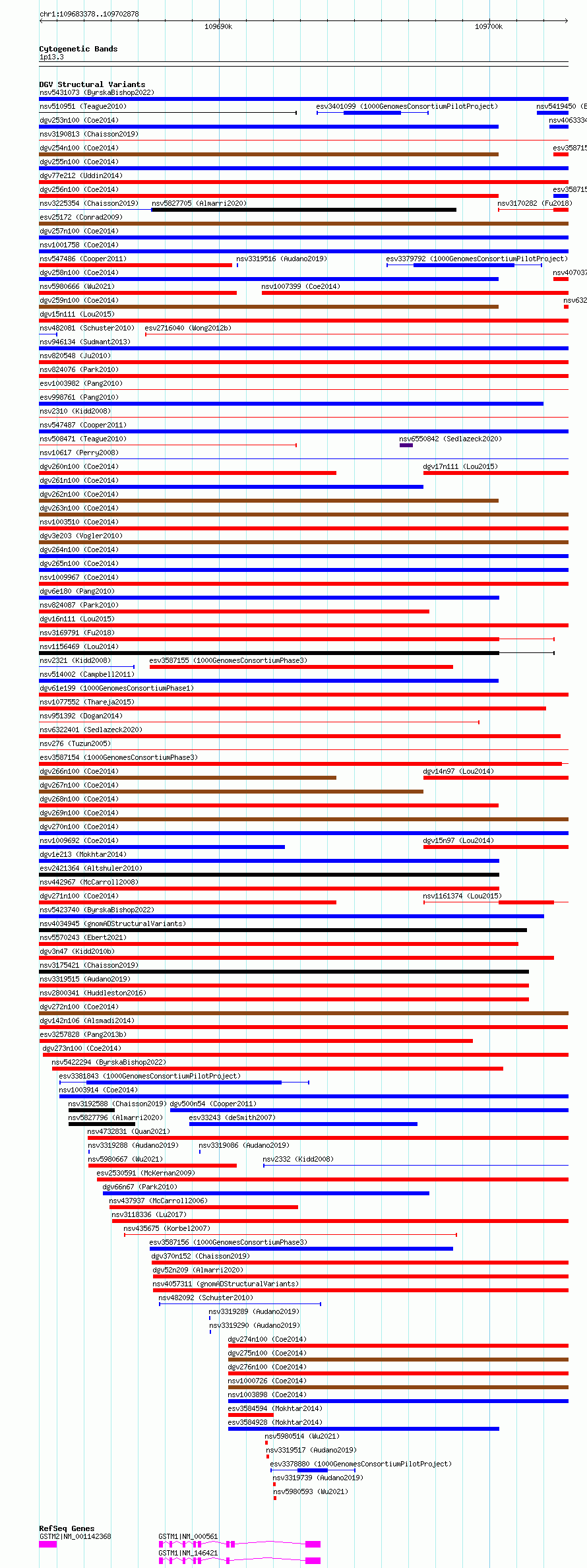 Variant DetailsVariant: dgv142n106| Internal ID | 22793970 | | Landmark | | | Location Information | | | Cytoband | 1p13.3 | | Allele length | | Assembly | Allele length | | hg38 | 19501 | | hg19 | 19501 |