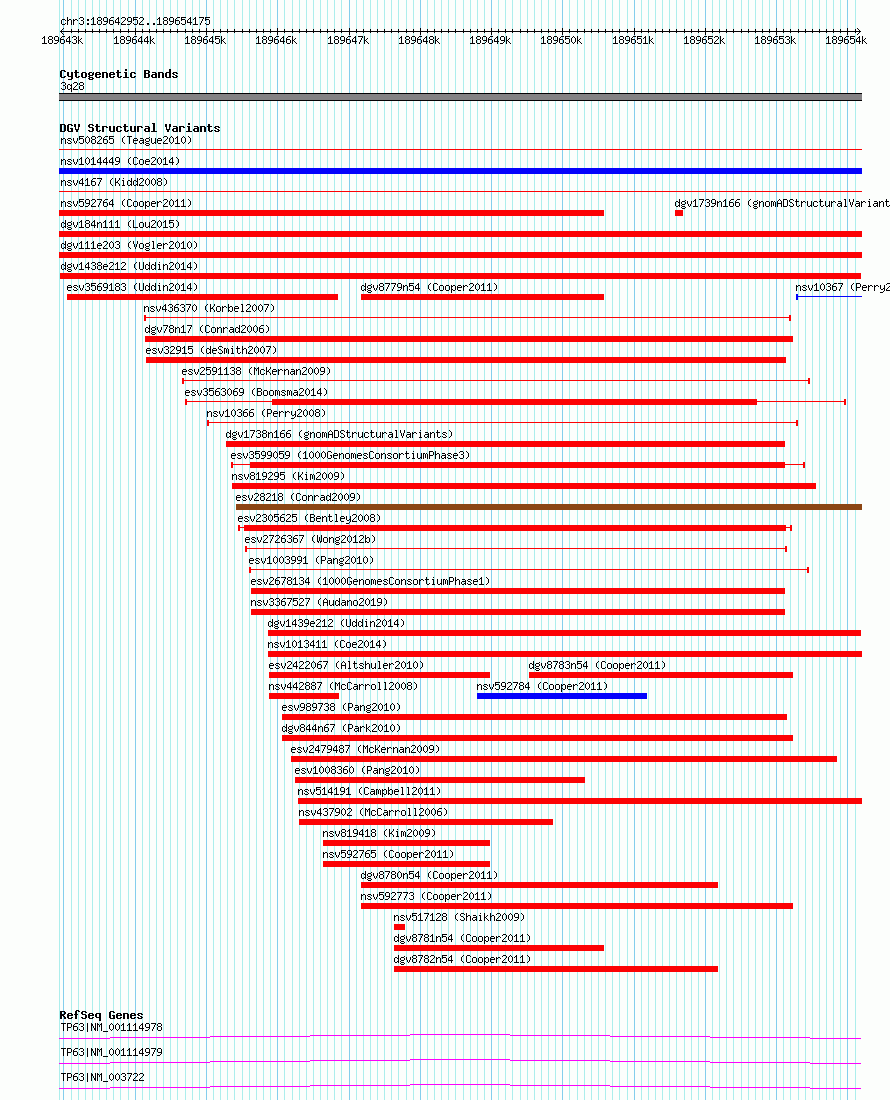 Variant DetailsVariant: dgv1438e212 | Internal ID | 20149894 | | Landmark | | | Location Information | | | Cytoband | 3q28 | | Allele length | | Assembly | Allele length | | hg38 | 11224 | | hg19 | 11224 |