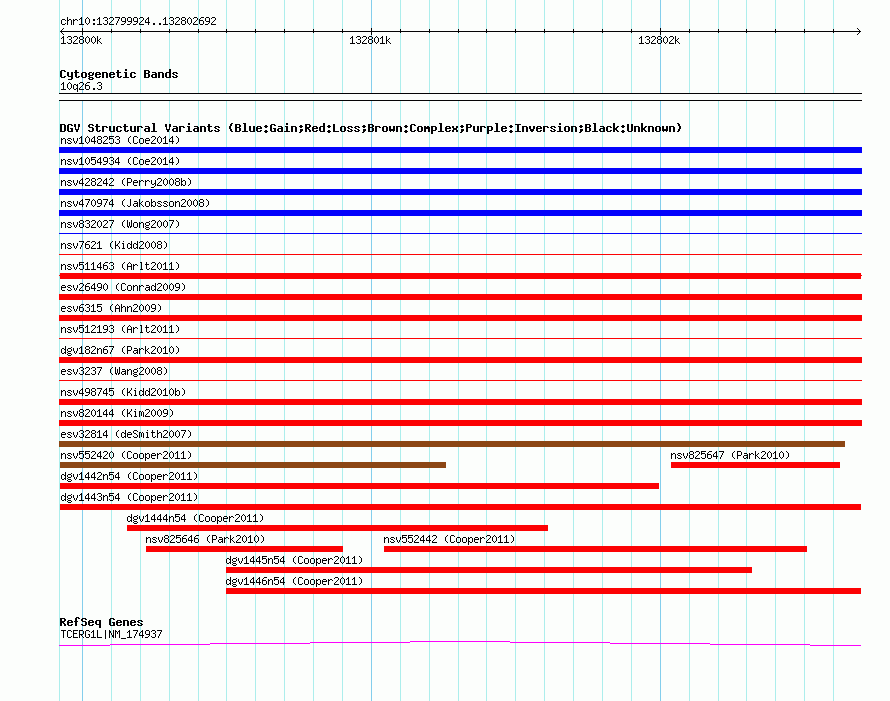 Variant DetailsVariant: dgv1443n54| Internal ID | 22769338 | | Landmark | | | Location Information | | | Cytoband | 10q26.3 | | Allele length | | Assembly | Allele length | | hg38 | 2769 | | hg19 | 2769 | | hg18 | 2769 |