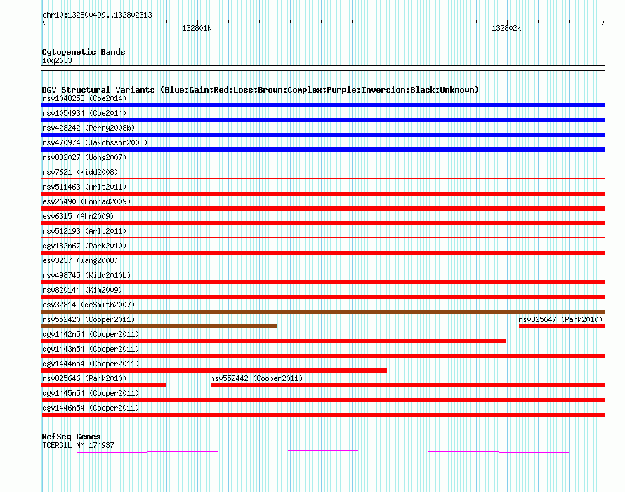 Variant DetailsVariant: dgv1445n54| Internal ID | 22769340 | | Landmark | | | Location Information | | | Cytoband | 10q26.3 | | Allele length | | Assembly | Allele length | | hg38 | 1815 | | hg19 | 1815 | | hg18 | 1815 |
