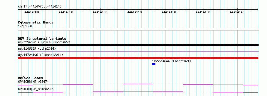Variant DetailsVariant: dgv1470n106| Internal ID | 22795298 | | Landmark | | | Location Information | | | Cytoband | 17q21.31 | | Allele length | | Assembly | Allele length | | hg38 | 70 | | hg19 | 70 |
