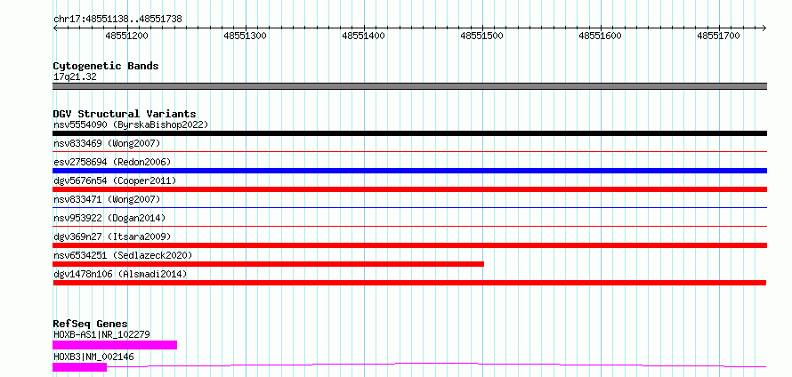 Variant DetailsVariant: dgv1478n106| Internal ID | 22795306 | | Landmark | | | Location Information | | | Cytoband | 17q21.32 | | Allele length | | Assembly | Allele length | | hg38 | 601 | | hg19 | 601 |