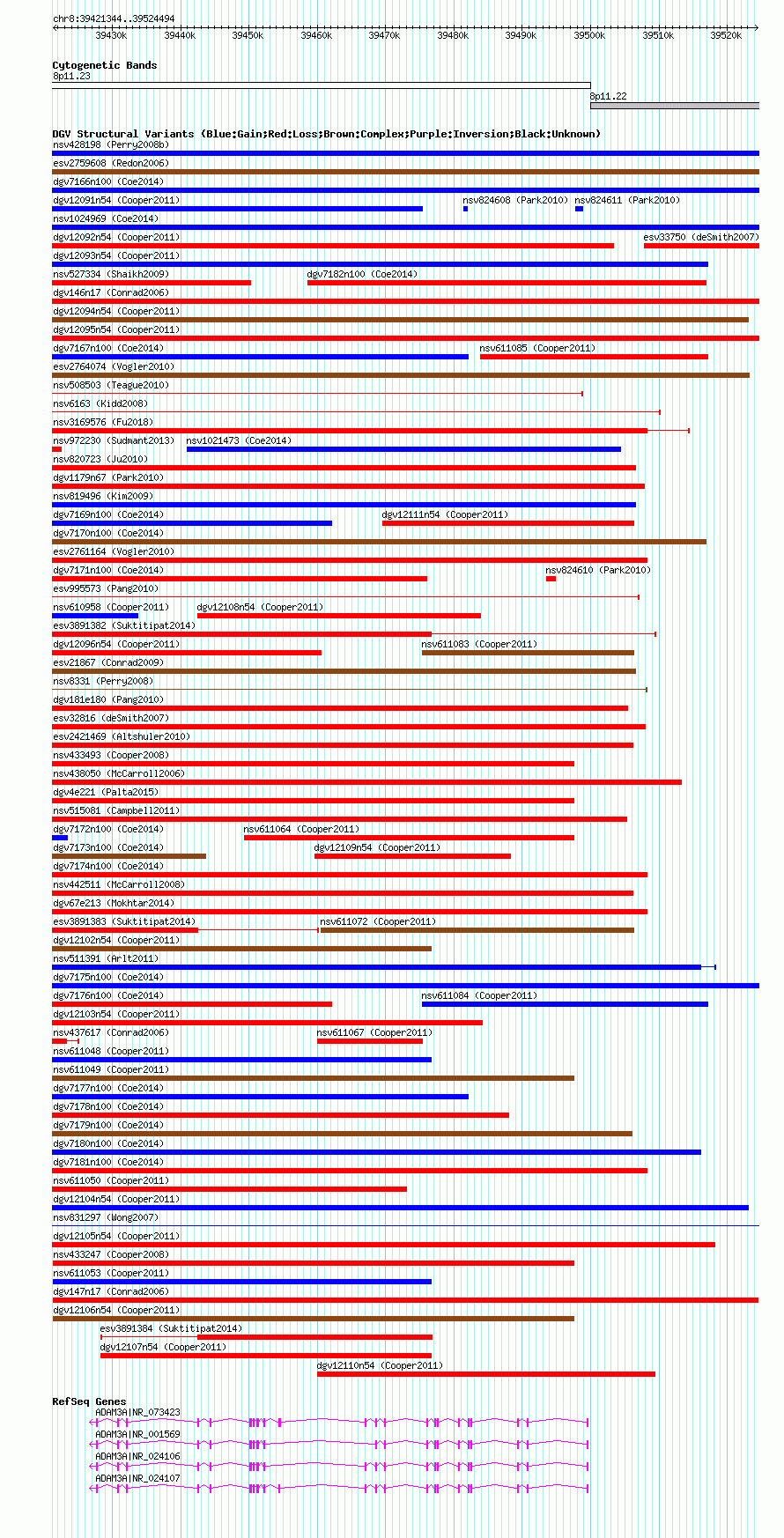Variant DetailsVariant: dgv147n17 | Internal ID | 22766184 | | Landmark | | | Location Information | | | Cytoband | 8p11.22 | | Allele length | | Assembly | Allele length | | hg38 | 103151 | | hg19 | 103151 | | hg18 | 103151 | | hg16 | 103151 |