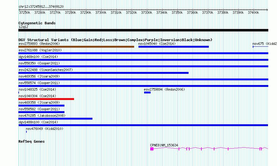 Variant DetailsVariant: dgv1488n100| Internal ID | 22787575 | | Landmark | | | Location Information | | | Cytoband | 12q12 | | Allele length | | Assembly | Allele length | | hg38 | 163209 | | hg19 | 163209 | | hg18 | 163209 |