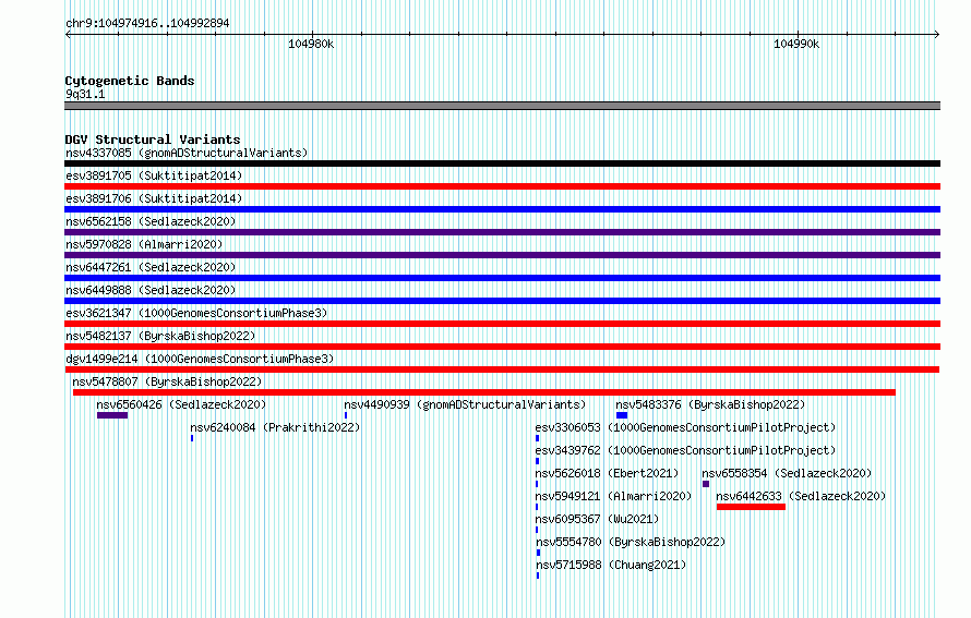 Variant DetailsVariant: dgv1499e214| Internal ID | 22757393 | | Landmark | | | Location Information | | | Cytoband | 9q31.1 | | Allele length | | Assembly | Allele length | | hg38 | 17979 | | hg19 | 17979 |