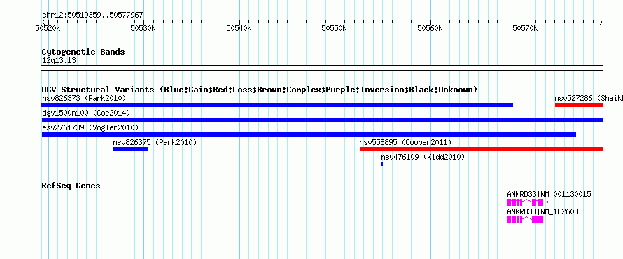 Variant DetailsVariant: dgv1500n100| Internal ID | 20153116 | | Landmark | | | Location Information | | | Cytoband | 12q13.13 | | Allele length | | Assembly | Allele length | | hg38 | 58609 | | hg19 | 58609 | | hg18 | 58609 |