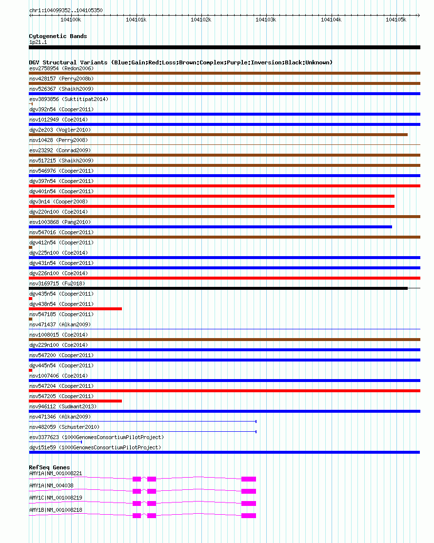 | | Variant Type | CNV duplication | | Copy Number | | | Allele State | | | Allele Origin | | | Probe Count | | | Validation Flag | | | Merged Status | M | | Merged Variants | | | Supporting Variants | esv3356736, esv3368815 | | Samples | NA19239, NA12892 | | Known Genes | AMY1A, AMY1B, AMY1C | | Method | Sequencing | | Analysis | | | Platform | Illumina | | Comments | | | Reference | 1000_Genomes_Consortium_Pilot_Project | | Pubmed ID | 20981092 | | Accession Number(s) | dgv151e59