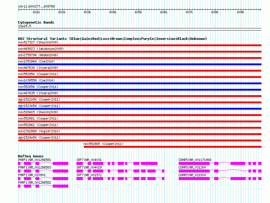 | Variant Type | CNV loss | Copy Number | | Allele State | | Allele Origin | | Probe Count | | Validation Flag | | Merged Status | M | Merged Variants | | Supporting Variants | nsv552864, nsv552863 | Samples | | Known Genes | CDHR5, IRF7, PHRF1 | Method | SNP array | Analysis | Illumina SNP array copy number analysis | Platform | Not reported | Comments | | Reference | Cooper_et_al_2011 | Pubmed ID | 21841781 | Accession Number(s) | dgv1524n54