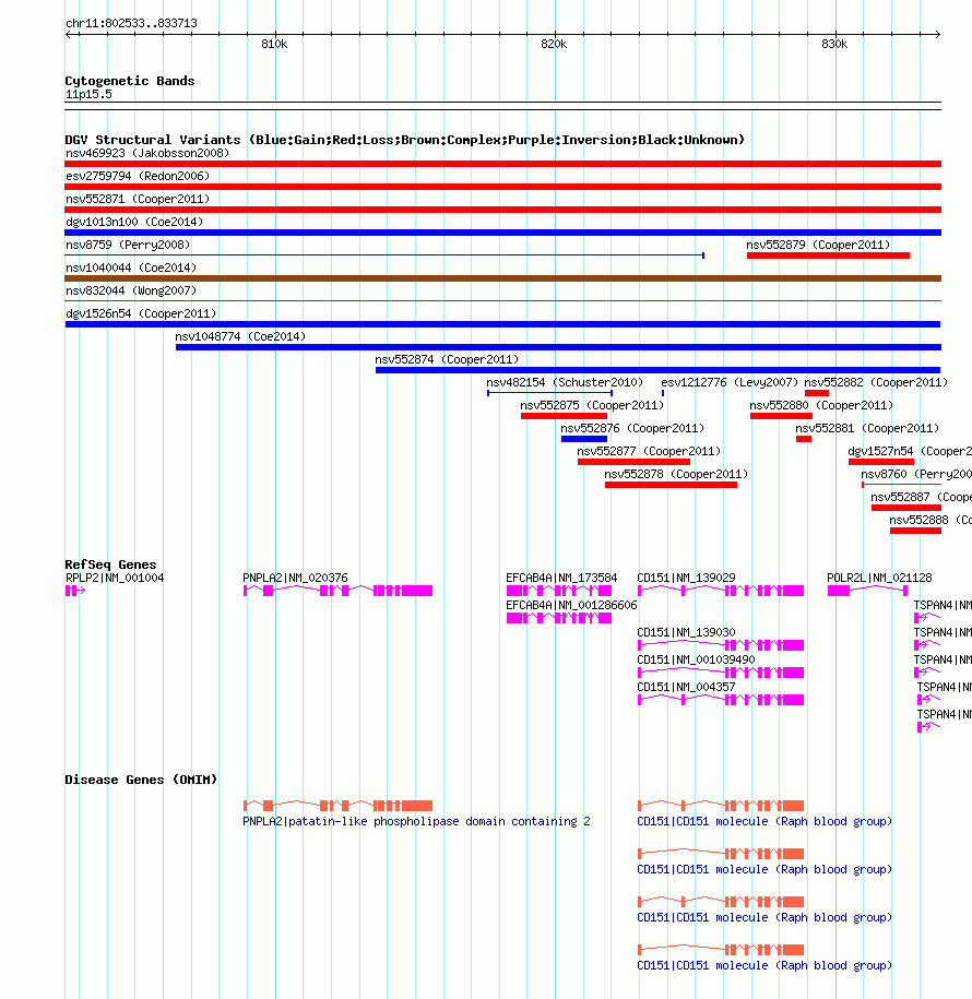 | Variant Type | CNV gain | Copy Number | | Allele State | | Allele Origin | | Probe Count | | Validation Flag | | Merged Status | M | Merged Variants | | Supporting Variants | nsv552872, nsv552873 | Samples | | Known Genes | CD151, EFCAB4A, PNPLA2, POLR2L, RPLP2, TSPAN4 | Method | SNP array | Analysis | Illumina SNP array copy number analysis | Platform | Not reported | Comments | | Reference | Cooper_et_al_2011 | Pubmed ID | 21841781 | Accession Number(s) | dgv1526n54