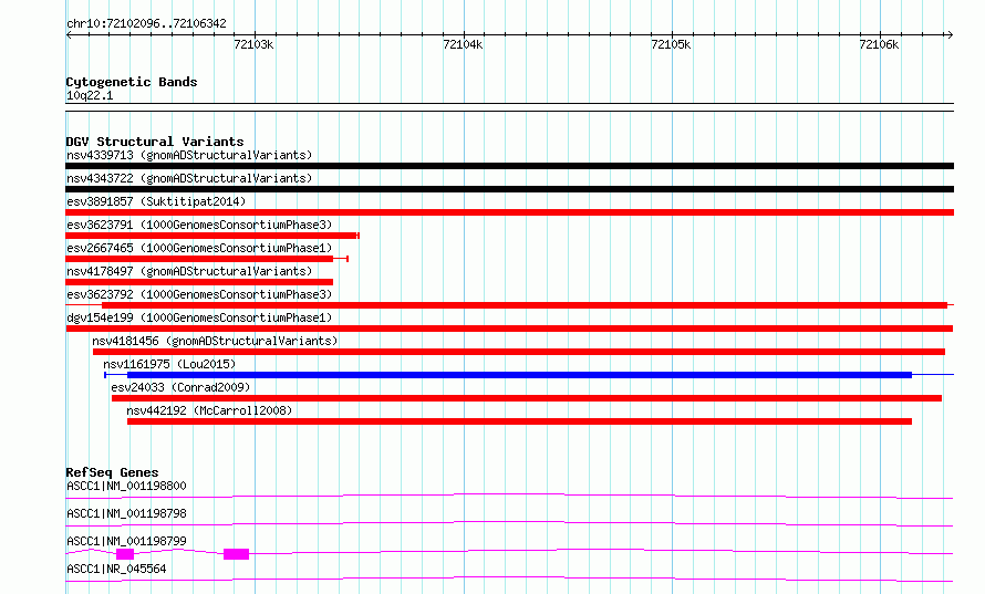 Variant DetailsVariant: dgv154e199| Internal ID | 20123456 | | Landmark | | | Location Information | | | Cytoband | 10q22.1 | | Allele length | | Assembly | Allele length | | hg38 | 4247 | | hg19 | 4247 |