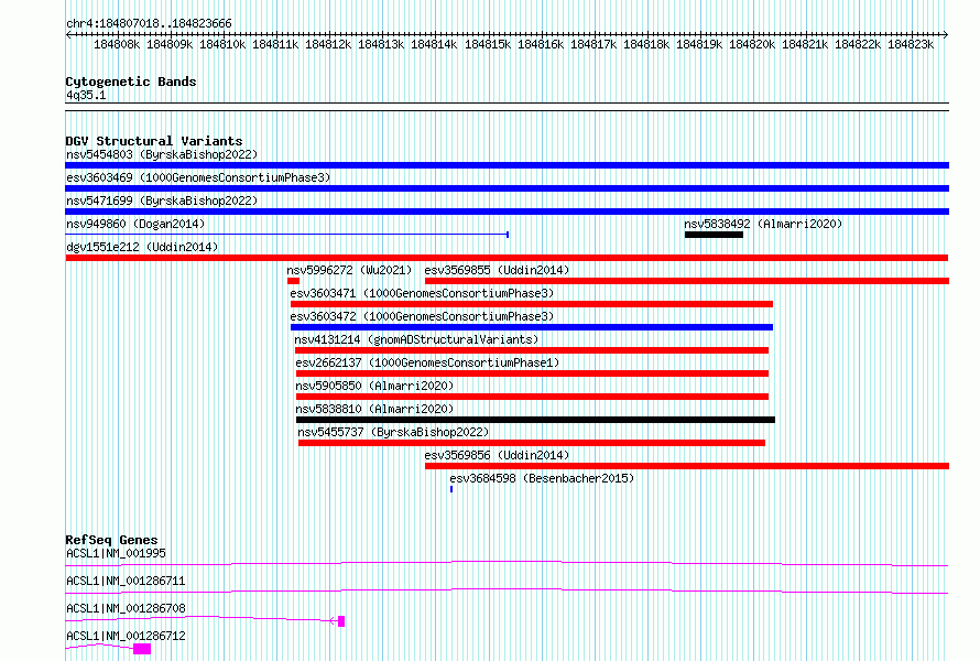 Variant DetailsVariant: dgv1551e212| Internal ID | 22784478 | | Landmark | | | Location Information | | | Cytoband | 4q35.1 | | Allele length | | Assembly | Allele length | | hg38 | 16649 | | hg19 | 16649 |